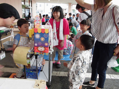 今回の「はらまち夜市」は、「お店屋さんの体験」を実施しました。事前に募集させていただきました。(^_-)-☆氷屋さんも、ポップコーン屋さんも…